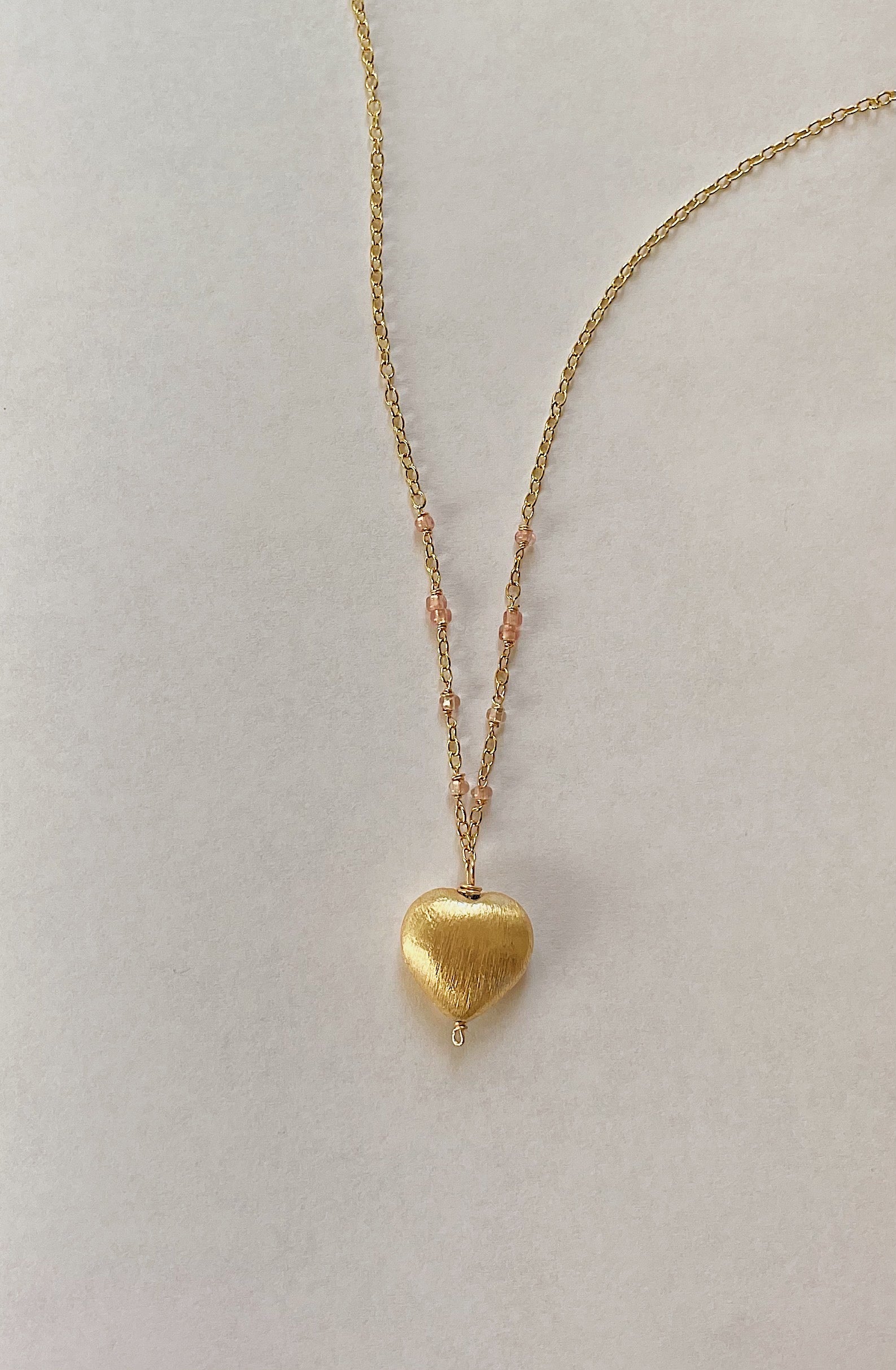 Gold filled necklace. The sweetest gold filled heart charm with light pink beads to add unique character.